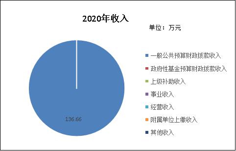 2020年本年收入合计136.66万元,其中:一般公共预算财政拨款收入136.66万元,占100%;政府性基金预算财政拨款收入0万元,占0%;上级补助收入0万元,占0%;事业收入0万元,占0%;经营收入0万元,占0%;附属单位上缴收入0万元,占0%;其他收入0万元,占0%。
