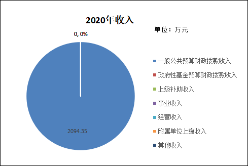 2020年收入合计2094.4万元,其中:一般公共预算财政拨款本年收入2094.4万元,占100%;政府性基金预算财政拨款收入0 万元;其他收入0万元。
