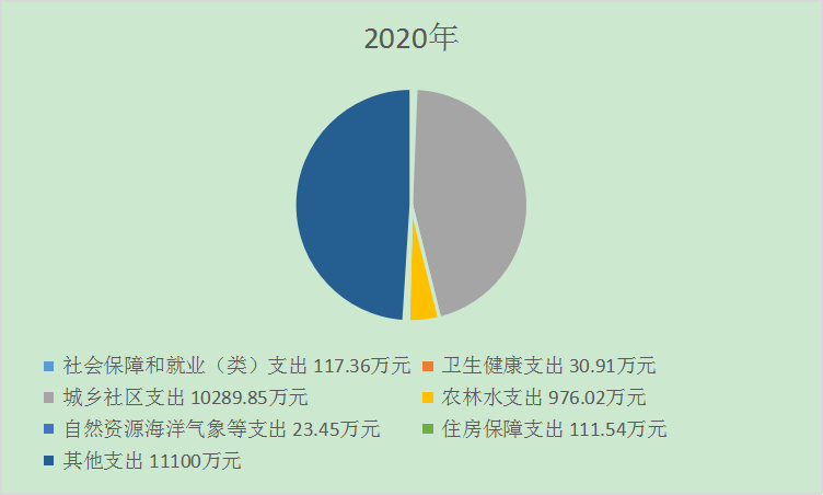 2020年一般公共预算财政拨款支出22649.14万元,主要用于以下方面:社会保障和就业(类)支出117.36万元,占0.5%;卫生健康支出30.91万元,占0.13%;城乡社区支出10289.85万元,占45.47%;农林水支出976.02万元,占4.3%;自然资源海洋气象等支出23.45万元,占0.1%。住房保障支出111.54万元,占0.5%。其他支出11100万元,占49%。