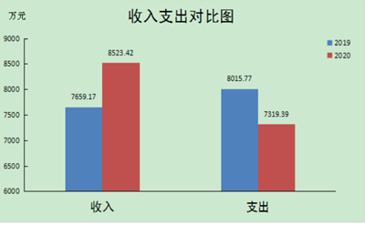 2020年总收入8523.42万元,较2019年相比增加864.25万元,增加11%。,总支出7319.39万元,较2019年相比减少696.39万元,减少8%。