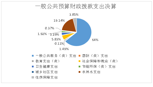 2020年一般公共预算财政拨款支出1342.20万元,主要用于以下方面:一般公共服务(类)支出858.90万元,占64%;国防(类)支出1.6万元,占比 0.11%;教育支出(类)20万元,占1.49%;社会保障和就业(类)支出78.21万元,占5.83%;卫生健康支出44.10万元,占3.29%;节能环保(类)支出25.82万元,占比1.92%;城乡社区支出5万元,占比0.37%;农林水支出256.96万元,占比19.14%;住房保障支出51.61万元,占3.85%;