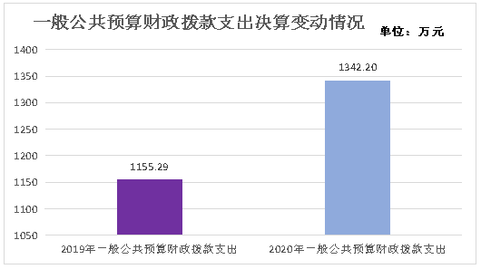 2020年一般公共预算财政拨款支出1342.20万元,占本年支出合计的100%。与2019年相比,一般公共预算财政拨款增加186.91万元,增长16.18%。主要变动原因是行政区调整,两乡镇合并人员增加、公用经费增加。