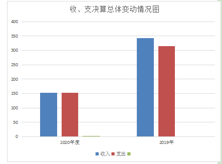 2020年度收入总计152.93万元,与2019年相比,收入总计减少189.18万元,减少123%;支出总计152.93万元,与2019年相比,支出增加315.04万元,减少206%。主要变动原因:因决算口径变化,财政代扣工会经费220万未纳入决算。