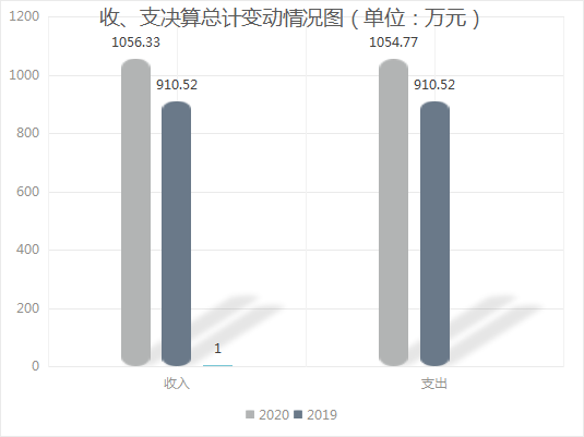 2020年度收入总计1056.33万元,支出总计1054.77万元。与2019年相比,收入增加145.81,增加16%;支出增加144.25万元,增加15.8%。主要变动原因是:(一)人员变动工资福利增加。(二)项目支出增加。