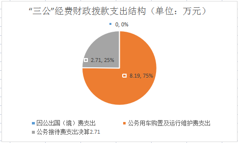 2020年“三公”经费财政拨款支出决算中,因公出国(境)费支出决算0万元,占0%;公务用车购置及运行维护费支出决算8.19万元,占75.13%;公务接待费支出决算2.71万元,占24.87%。具体情况如下:
