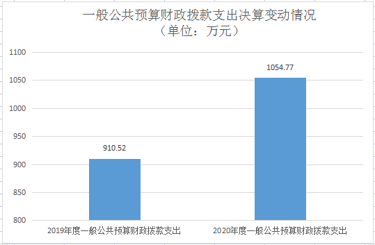 2020年一般公共预算财政拨款支出1054.77万元,占本年支出合计的100%。与2019年相比,一般公共预算财政拨款支出减少支出增加329.48万元,上升45.42%。主要变动原因是(一)人员变动工资福利增加。(二)项目支出增加。