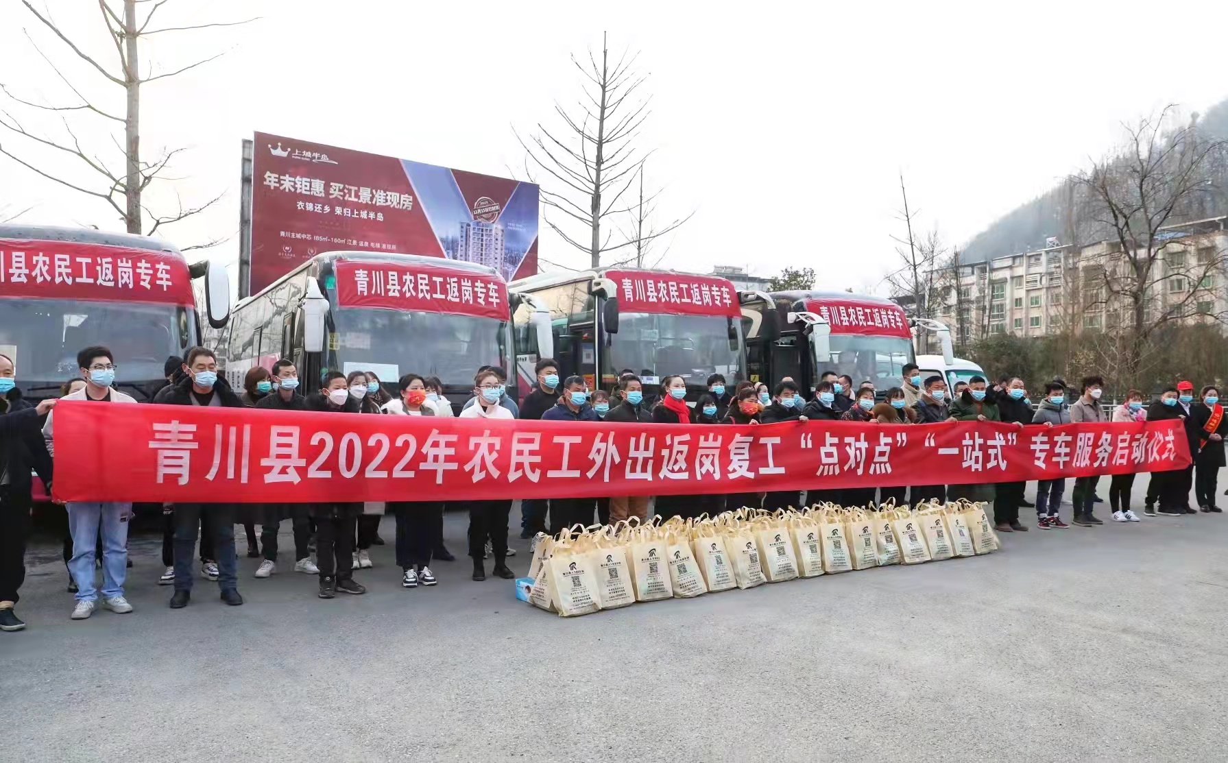 2022年2月9日上午8点30,青川县人力资源和社会保障局举办农民工外出返岗复工“点对点”“一站式”专车服务启动仪式。此次返岗复工专车首发4辆112人,发放返岗复工暖心礼包112份(含防疫用品、宣传资料、食品等),主要发往成都、重庆等地。