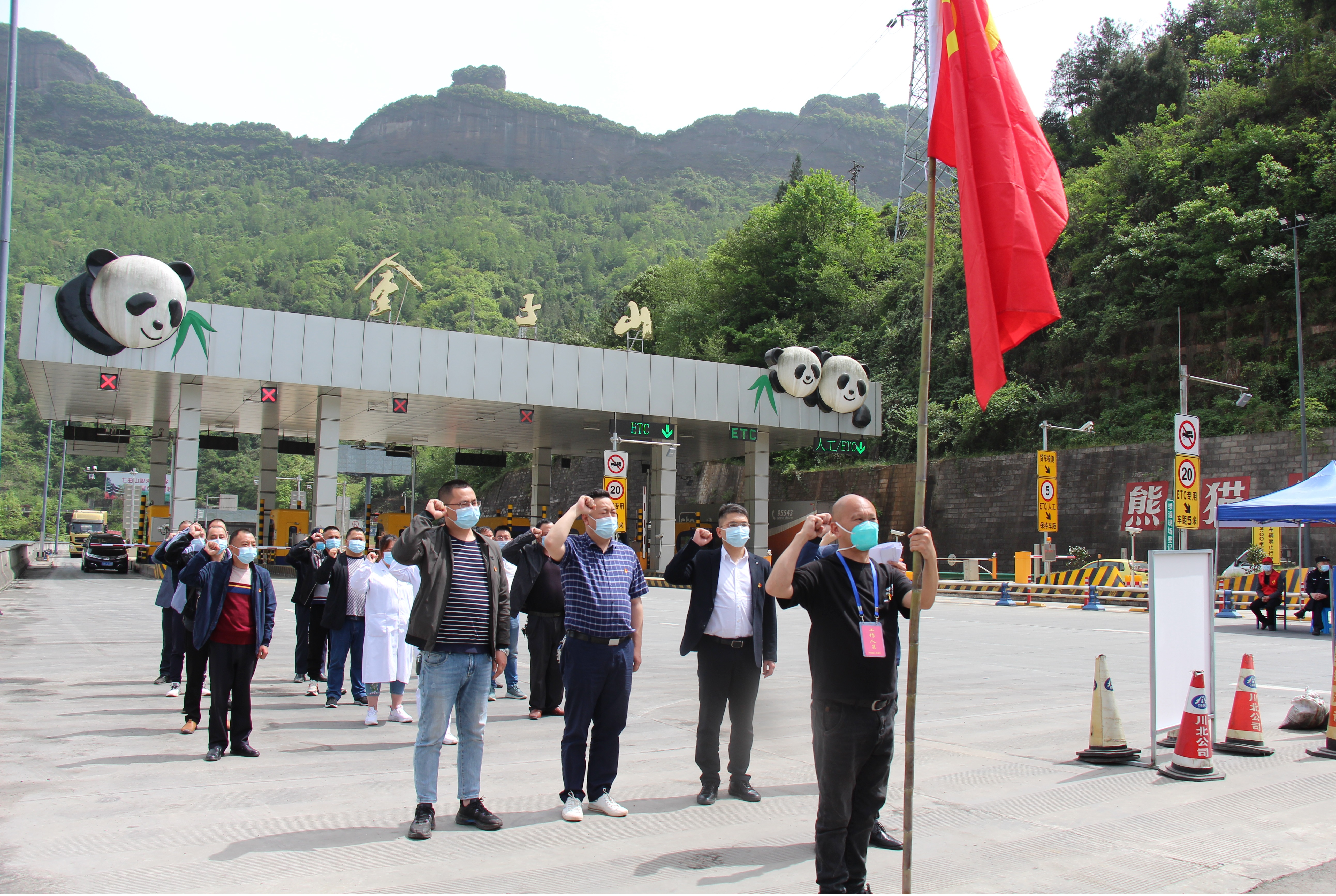 4月12日,在绵广高速金子山出口处,举行了竹园镇金子山疫情防控临时联合党支部成立仪式,县委常委、副县长何立剑出席活动并讲话。鲜红的党旗下,20余名党员干部右手握拳,庄严宣誓。