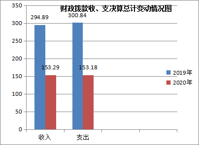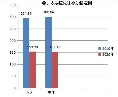 2020年度收入合计153.29万元,支出合计153.18万元,与2019相比,收入总计减少141.60万元,支出总计减少147.66万元,收入 总计减少了48.02%,支出总计减少了49.18%。减少的主要原因是减少了退休人员、在职人员丧葬费、抚恤金及目标考核奖等收入支出。(图1:收、支决算总计变动情况图)(柱状图)