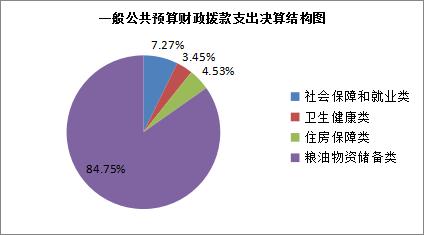 2020年一般公共预算财政拨款支出153.18万元,主要用于以下方面:社会保障和就业(类)支出11.13 万元,占支出比重为7.27%;卫生健康(类)支出5.29万元,占支出比重为3.45%;住房保障(类)支出6.94万元,占支出比重为4.53%,;粮油物资储备(类)支出129.82万元,占支出比重为84.75%。