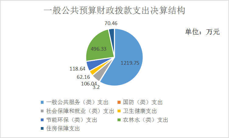 2020年一般公共预算财政拨款支出2076.59万元,主要用于以下方面:一般公共服务(类)支出1219.75万元,占58.74%;国防(类)支出3.2万元,占0.15%;社会保障和就业(类)支出106.04万元,占5.11%;卫生健康支出62.16万元,占2.99%;节能环保(类)支出118.64万元,占5.71%;农林水(类)支出496.33万元,占23.9%;住房保障支出70.46万元,占3.39%。