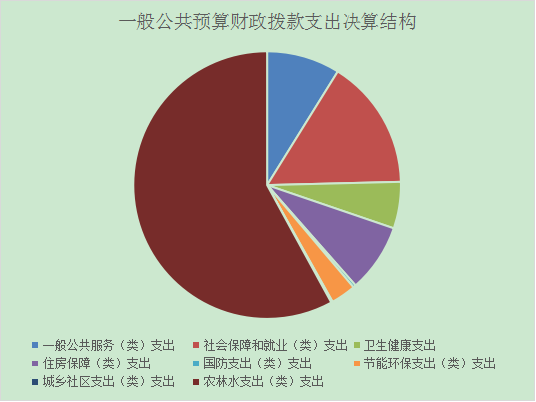 2020年一般公共预算支出2319.43786万元。其中,一般公共服务支出1116.8380.6万元,主要用于人大、政府、党群、财政、经济管理等事务支出。国防支出4.4万元,主要用于国防武装支出。社会保障和就业支出207.8916万元,主要用于医疗保险、行政事业单位退休人员费用。节能环保支出40万,主要用于农村垃圾处理及日常环境治理。医疗卫生支出74.1806万元,主要用于财政对基本医疗保险基金的补助。农林水事务支出767.0400万元,主要用于农业、村干部报酬及办公费、村级维护资金、扶贫事业等。住房保障支出109.0876万元,主要用于机关单位职工住房公积金支出。