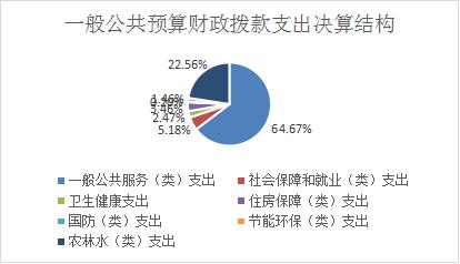 2020年一般公共预算财政拨款支出819.69万元,主要用于以下方面:一般公共服务(类)支出530.11万元,占64.67%;社会保障和就业(类)支出42.43万元,占5.18%;卫生健康支出20.25万元,占2.47%;住房保障(类)支出28.4万元,占3.46%;国防(类)支出1.6万元,占0.2%;节能环保(类)支出12万元,占1.46%;农林水(类)支出184.9万元,占22.56%。