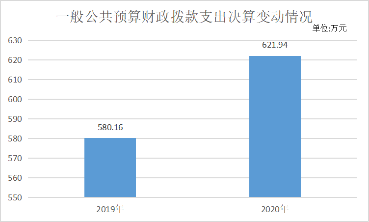 2020年一般公共预算财政拨款支出621.94万元,占本年支出合计的100.00%。与2019年相比,一般公共预算财政拨款增加41.78万元,增长7.2%。主要变动原因是编制内实有人数增加,导致人员基本支出及日常事务公用支出收支增加。