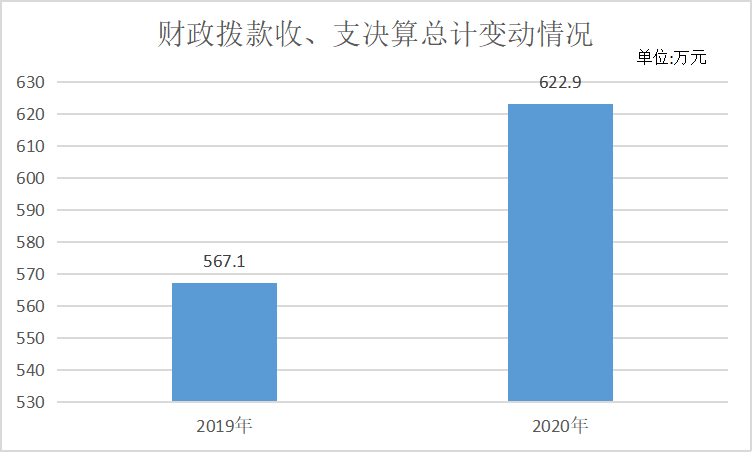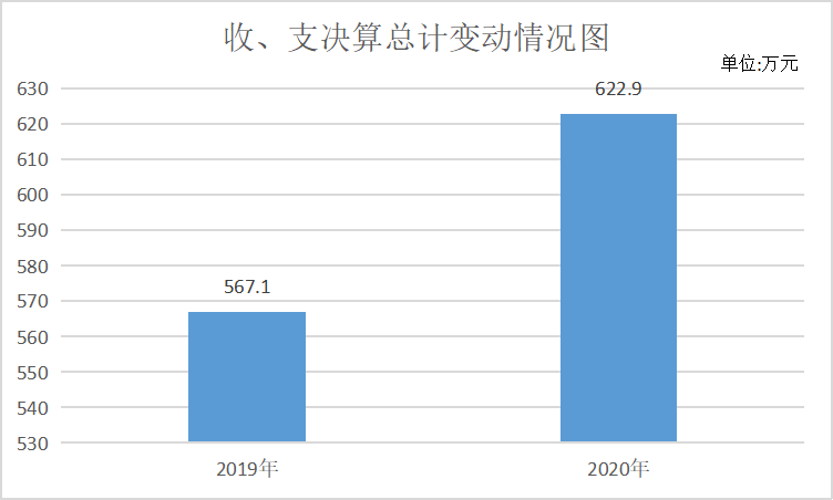 2020年度收、支总计622.9万元。与2019年相比,收、支总计各增加55.8万元,增长9.84%。主要变动原因是编制内实有人数增加,导致人员基本支出及日常事务公用支出收支增加。