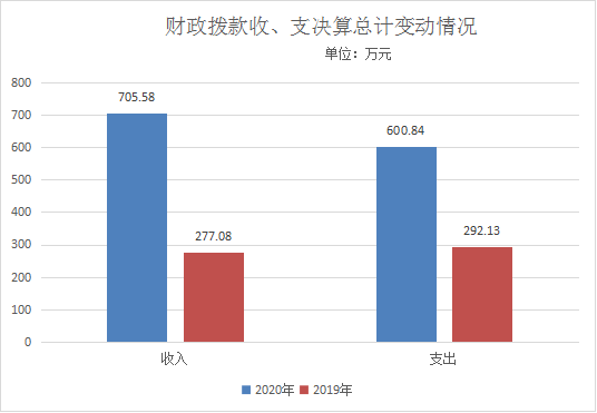 2020年财政拨款收入总计705.58万元、支出总计600.84万元。与2019年相比,财政拨款收入总计增加收入总计增加428.5万元,增长154%;支出总计增加308.71,增长105%。主要变动原因是机构改革后,县精神文明建设委员会办公室合并至县委宣传部,县文明办用于乡村学校少年宫的中央、省级补助资金、运行维护费、社会主义核心价值观建设等费用较多;公益电影放映补助资金48.36万元;用于新中国成立70周年氛围营造5万元;70周年经济社会发展成就宣传经费16.72万元;70周年栖凤廊桥摄影展费15万元。