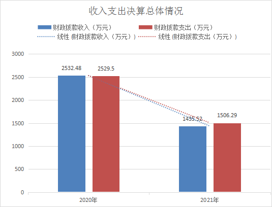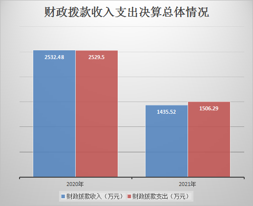 2021年财政拨款收入总计1435.52万元、支出总1506.29万元。与2020年相比,财政拨款收入总计减少1096.96万元,下降43.32%、支出总计减少1023.21万元,下降40.45%。主要变动原因是2020年农民工应急周转金1120万元纳入当年收入及支出,2021年无农民工应急周转金。