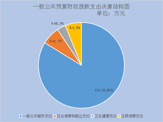 2021年一般公共预算财政拨款支出137.45万元,主要用于以下方面:一般公共服务(类)支出115.16元,占83.78%;社会保障和就业(类)支出9.41万元,占6.85%;卫生健康支出4.48万元,占3.26%;住房保障支出8.40万元,占6.11%。