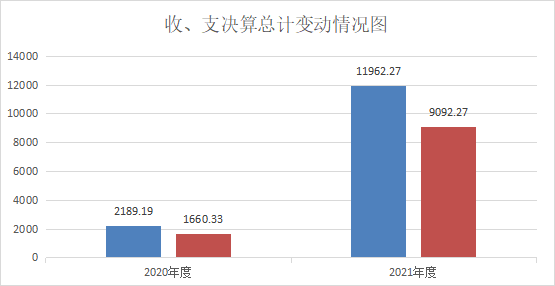 2021年度收入总计11281.46万元,支出总计11962.27万元。与2020年相比,收、支总计各增加9092.27万元、10301.94万元,分别增长415%、620%。主要变动原因是2021年新增青溪古城4A级景区提升项目政府性基金预算财政拨款收入。