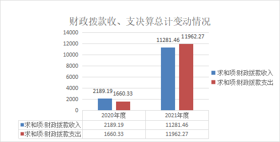 2021年财政拨款收入总计11281.46万元,支出总计11962.27万元。与2020年相比,财政拨款收、支总计各增加9092.27万元、10301.94万元,分别增长415%、620%。主要原因是新增青溪古城4A级景区提升项目政府性基金预算财政拨款收入。