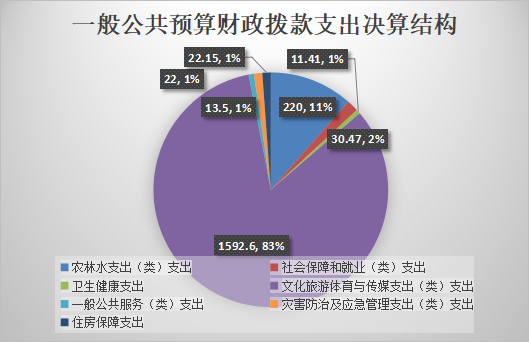 2021年一般公共预算财政拨款支出1912.12万元,主要用于以下方面:一般公共服务(类)支出13.5万元,占0.7%;文化旅游体育与传媒支出(类)支出1592.6万元,占83%;社会保障和就业(类)支出30.47万元,占1.6%;卫生健康支出11.41万元,占0.5%;农林水支出(类)支出220万元,占12%;住房保障支出22.15万元,占1.1%;灾害防治及应急管理支出(类)支出22万元,占1.1%。