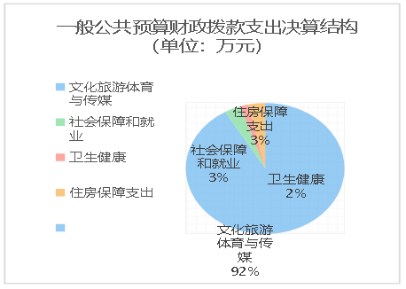 2021年一般公共预算财政拨款支出54.26万元,主要用于以下方面:文化旅游体育与传媒(类)支出49.69万元,占92%;社会保障和就业支出(类)1.81万元,占3%;卫生健康支出(类)支出0.91万元,占2%;住房保障支出1.84万元,占3%。