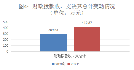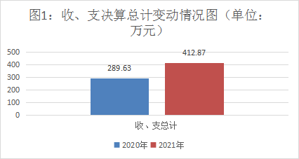 | 2021年度收、支总计412.87万元。与2020年相比,收、支总计各增加123.24万元,增长42.55%。主要变动原因是项目增加。 |