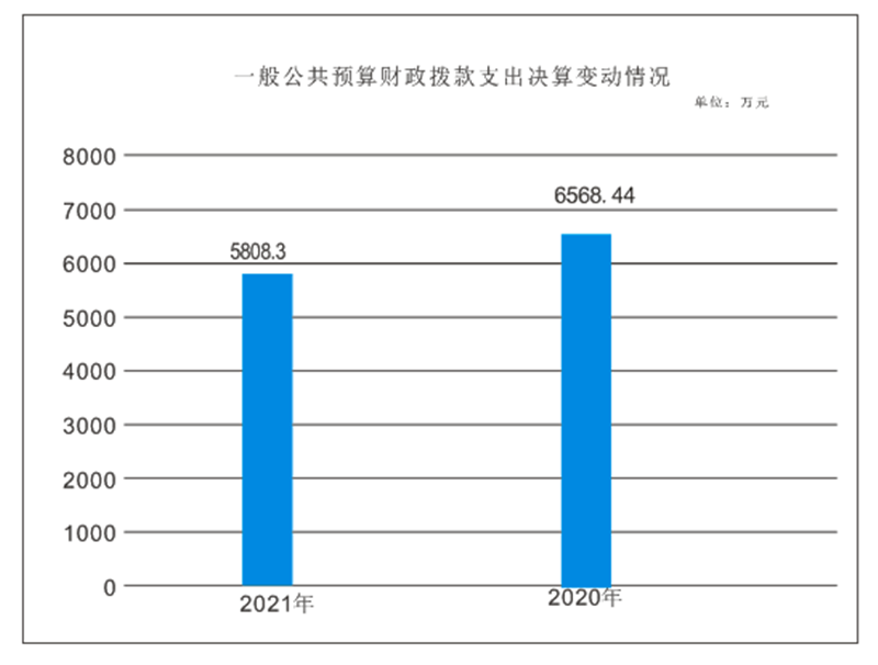 2021年一般公共预算财政拨款支出5808.3万元,占本年支出合计的100%。与2020年相比,一般公共预算财政拨款支出减少760.14万元,下降12%。主要变动原因是项目经费收、支减少及人员减少,导致经费收、支减少。