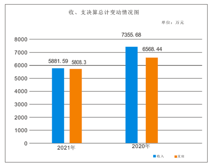 2021年度收入总计5881.59万元、支出总计5808.3万元。与2020年相比,收入减少1474.09万元,下降20%,支出减少760.14万元,下降12%。主要变动原因是项目经费收、支减少及人员减少,导致经费收、支减少。
