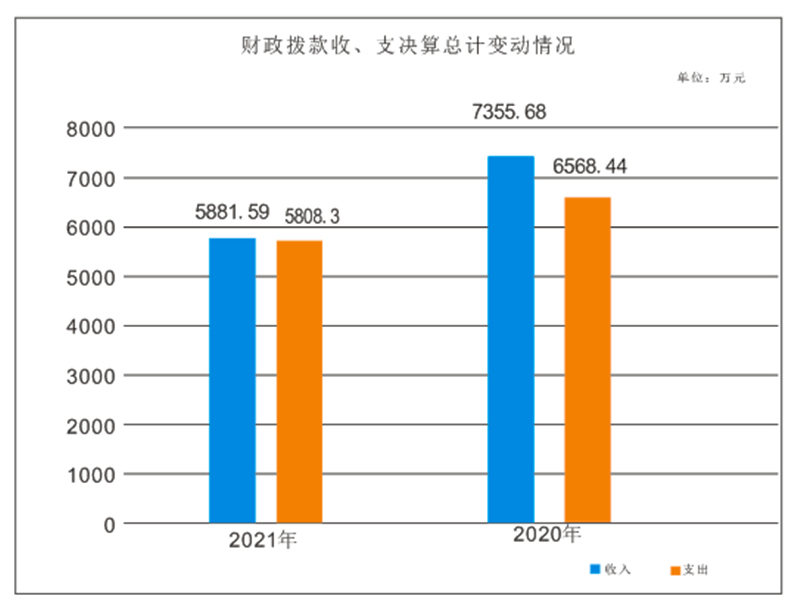 2021年财政拨款收入总计5881.59万元、支出总计5808.3万元。与2020年相比,财政拨款收入减少1474.09万元,下降20%,支出减少760.14万元,下降12%。主要变动原因是项目经费收、支减少及人员减少,导致经费收、支减少。
