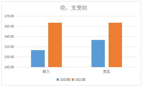 2021年度收、支总计166.73万元。与2020年相比,收入总计增加13.44万元,增长8.77%,支出总计增加8.32万元,增长5.25%,主要变动原因是今年新增一人,人员公用经费增加,导致一般公共预算财政拨款增加,疫情防控、公用经费支出增加。