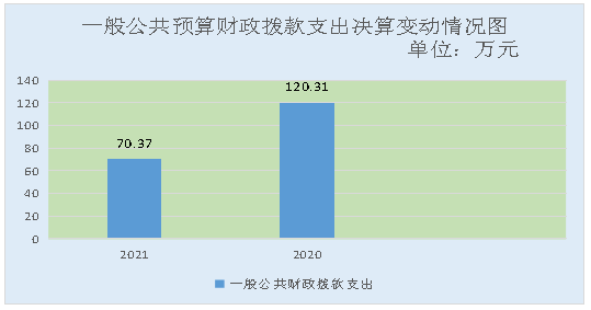 2021年一般公共预算财政拨款支出70.37万元,占本年支出合计的100%。与2020年相比,一般公共预算财政拨款减少46.59万元,下降41.51%。主要变动原因是:人员经费及日常公用经费开支减少。