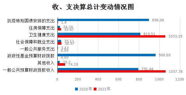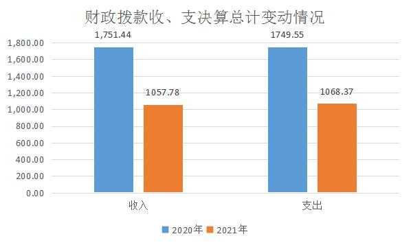 2021年财政拨款收入总计1057.78万元、支出总计1068.37万元。与2020年相比,财政拨款收入减少693.66万元,下降40%、支出总计各减少681.18万元,下降39%。主要变动原因是2021年较2020年减少了政府性基金预算财政拨款960万元,2020年由于新冠肺炎疫情防控,新增抗疫特别国债,2021年无新增项目。