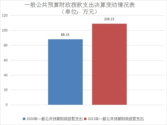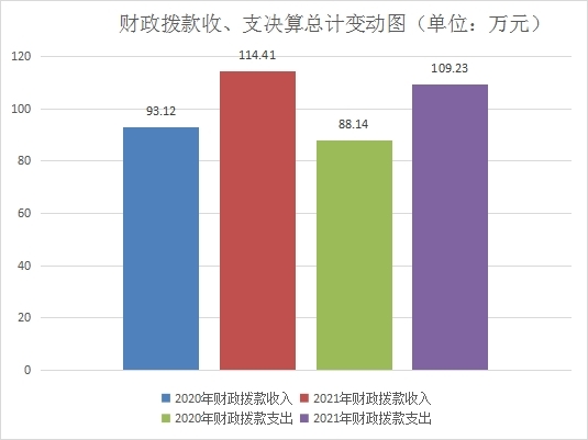 2021年财政拨款收入总计114.41万元、与2020年相比财政拨款收入增加21.29万元、增加22.86%。2021年支出总计109.23万元,与2020年相比支出增加21.09万元,增长23.93%,主要变动原因是基本支出增加。