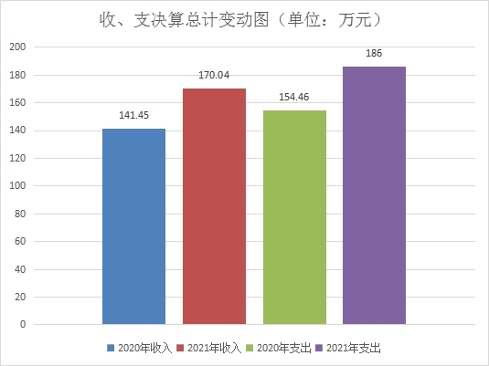 2021年度收入总计170.04万元、与2020年相比,收入增加28.59万元,增加20.24%,主要变动原因为本年度财政拨款收入和事业收入增加。2021年度支出总计186.00万元。与2020年相比,支出增加31.54万元,增加20.42%,主要变动原因是本年收入财政拨款支出增加。