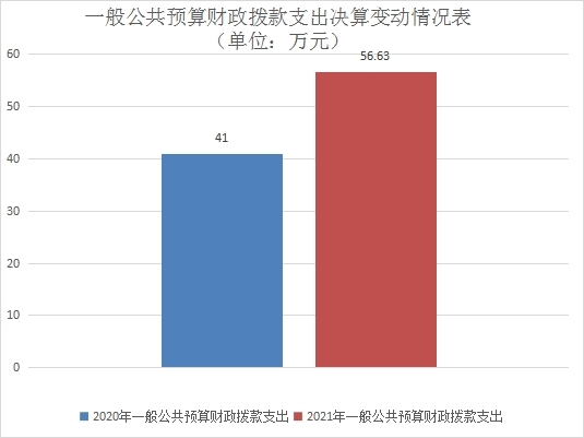 2021年一般公共预算财政拨款支出56.63万元,占本年支出合计的98.78%。与2020年相比,一般公共预算财政拨款支出增加15.63万元,增长38.12%。主要变动原因是本年度财政基本拨款支出和项目拨款支出增加。