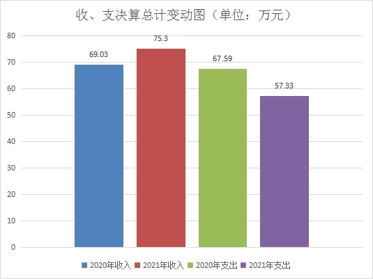 2021年度收入总计75.30万元、与2020年相比,收入增加6.27万元,增加9.08%,主要变动原因为本年度财政拨款收入增加。2021年度支出总计57.33万元,与2020年相比,支出减少 10.26万元,减少15.18%,主要变动原因是本年两项改革卫生院合并,5月之后公用经费支出减少。