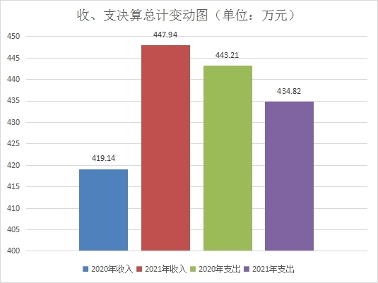 2021年度收入总计447.94万元、支出总计434.82万元。与2020年相比,收入比上年增加28.8万元、增加6.87%,支出总计减少8.38万元,下降8.15%。主要变动原因是公用经费减少,本年节省开支。