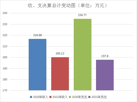 2021年度收入总计200.22万元、支出总计197.8万元。与2020年相比,收入比上年减少16.46万元、减少7.6%,支出总计减少36.97万元,下降15.75%。主要变动原因是医疗收入减少、公用经费支出减少。
