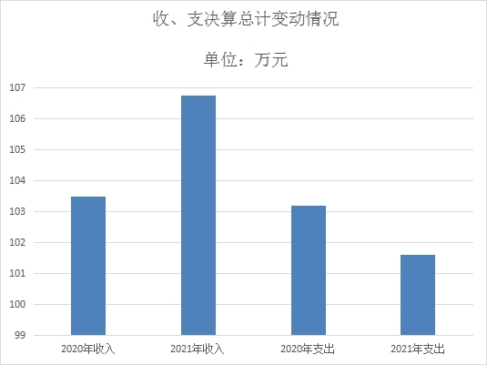 2021年财政拨款收入总计106.74万元。支出总计101.6万元。与2020年相比,财政拨款收入总计增加3.27万元,增加3.16%。财政拨款支出减少1.59万元,减少1.54%,主要变动原因是财政拨款当年增加、项目资金未使用完。