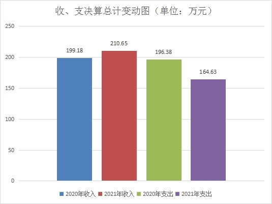 2021年度收入总计210.65万元、支出总计164.63万元。与2020年相比,收入比上年增加11.46万元、增加5.76%,支出总计减少31.75万元,下降27.68%。主要变动原因是医疗收入及财政补助收入增加、应付药款部分未付。