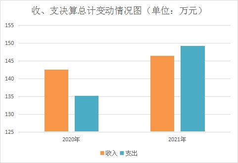 2021年度收入总计146.48万元,支出总计149.31万元。与2020年相比,收入总计增加3.95万元,增长2.77%,支出总计增加14.18万元,增长10.49%。主要变动原因是项目资金增加及工资调标等。