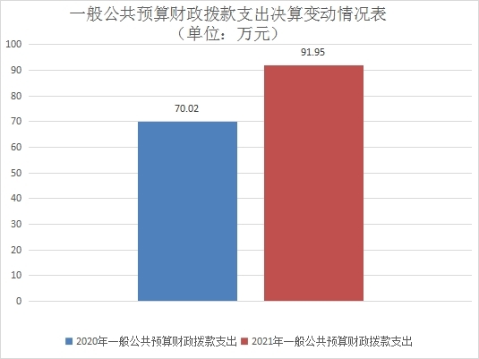2021年一般公共预算财政拨款支出91.95万元,占本年支出合计的71.46%。与2020年相比,一般公共预算财政拨款支出增加21.93万元,增长31.32%。主要变动原因是人员支出增加、上年结转项目资金在本年列支。