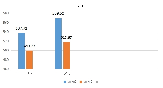 2021年度收入总计499.77万元、支出总计517.97总计万元。与2020年相比收入下降37.95万元,下降7.06%,支出下降51.54万元,下降9.05%。主要变动原因收入下降是财政核定任务数增加,疫情原因门诊、住院收入有所下降,支出下降是收入下降同时药品、耗材成本支出下降,项目减少支出同时减少。