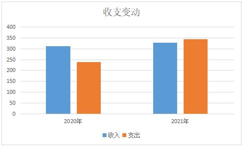 2021年度总收入总计328.14万元。与2020年相比,收入增加15.96万元,增长5%。主要变动原因是新进人员增加,2021年度支出总计345.25万元。与2020年相比,支出增加106.42万元,增长45%,主要变动原因是支付部分前期未支付款项、正常调资工资福利费增加及疫情防控期间各项费用增加。