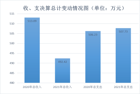 2021年度收入总计492.42万元,支出总计507.73万元。与2020年相比,收入总计减少20.67万元,下降4.00%,支出总计增加1.5万元,上升0.3%。主要变动原因是总收入变动的主要原因为:一是一般公共预算财政拨款收入减少了22.22万元,主要原因为退休1人,二是其他收入增加了1.55万元,主要原因为2021年增加了锅炉处置补贴。总支出变动的主要原因为:一是教育支出减少了15.32万元,主要原因是退休1人;二是社会保障和就业支出增加5.90万元,主要为职工人数较去年增加2人退休1人;三是卫生健康支出增加1.81万元,主要为职工人数较去年增加2人退休1人;四是住房保障支出增加9.11万元,主要为将发放的人员奖金纳入住房公积金缴存基数。