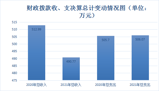 2021年财政拨款收入总计490.77万元。与2020年相比,财政拨款收入减少22.22万元,减少4.33%支出总计505.7万元,与2020年相比增加0.37万元,增长0.07%。主要变动以上主要变动原因:一是2021年教职工人数较2020年减少了1人导致财政拨款收入减少;二是2021年拨付以前年度人员资金及项目资金导致财政拨款支出增加。