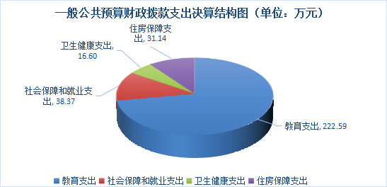 2021年一般公共预算财政拨款支出万元308.70万元,主要用于以下方面:教育支出222.59万元,占72.11%;社会保障和就业支出38.37万元,占12.43%;卫生健康支出16.60万元,占5.38%;住房保障支出31.14万元,占10.09%。