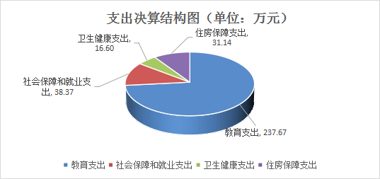 2021年本年支出合计323.78万元,其中:教育支出237.67万元,占73.40%;社会保障和就业支出38.37万元,占11.85%;卫生健康支出16.60万元,占5.13%;住房保障支出31.14万元,占9.62%。