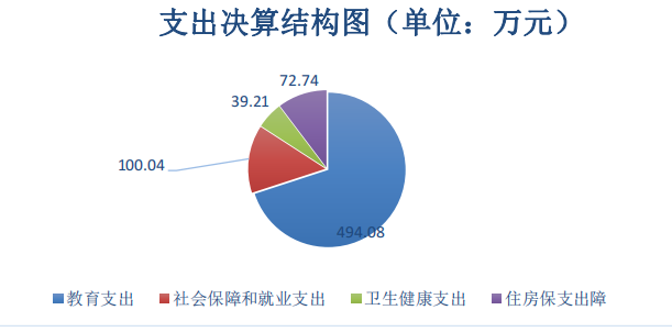 2021年本年支出合计706.07万元。其中教育支出:494.08万元,占比69.98%;社会保障和就业支出100.04万元,占比14.17%;卫生健康支出39.21万元,占比5.55%;住房保障支出72.74万元,占比10.35%。